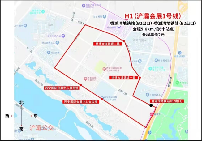 浐灞会展1号线全长5.6公里,共设置6个站点,采取顺时针循环模式,从香湖湾地铁站(B2出口)出发,经西安国际会展中心会议楼、西安国际会展中心展览馆、世博大道锦堤二路、世博大道锦堤一路,回到香湖湾地铁站(B2出口)。运营时间为7:30——19:30,全程运行时间约20分钟,平均发车间隔15分钟。乘车票价贰元一票制,“五一”期间使用长安通、长安通电子版(微信、支付宝等)半价优惠。