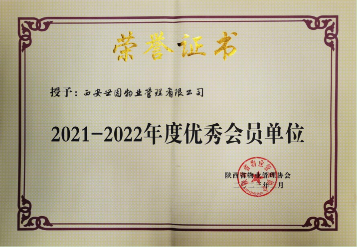近日,西安世园物业管理有限责任公司荣获陕西省物业管理协会“2021-2022年度优秀会员单位”称号,通过加强行业文化及业务专业交流,互鉴互学互促,以快速发展与专业优势得到省内业界广泛认可。