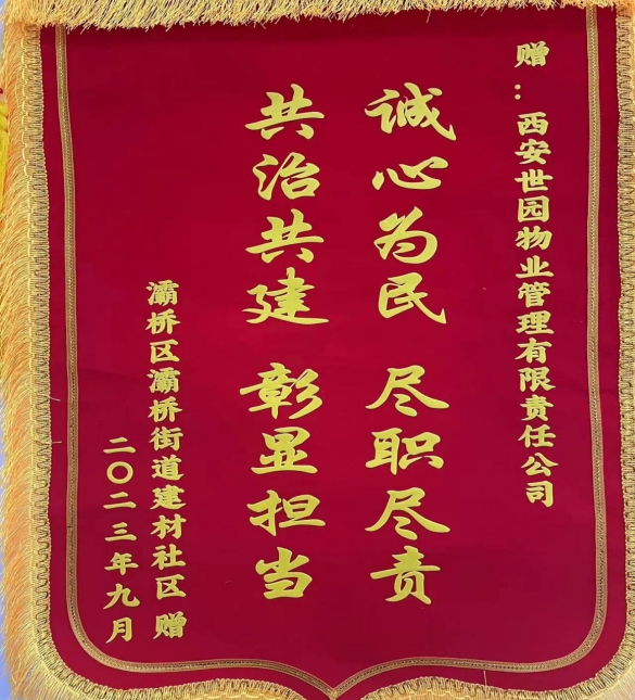 2023年9月28日,灞桥区灞桥街道建材社区向世园物业管理公司赠送“诚心为民 尽职尽责,共治共建 彰显担当”锦旗,对世园物业服务的三供一业建材小区物业服务及社区活动配合工作给予肯定。