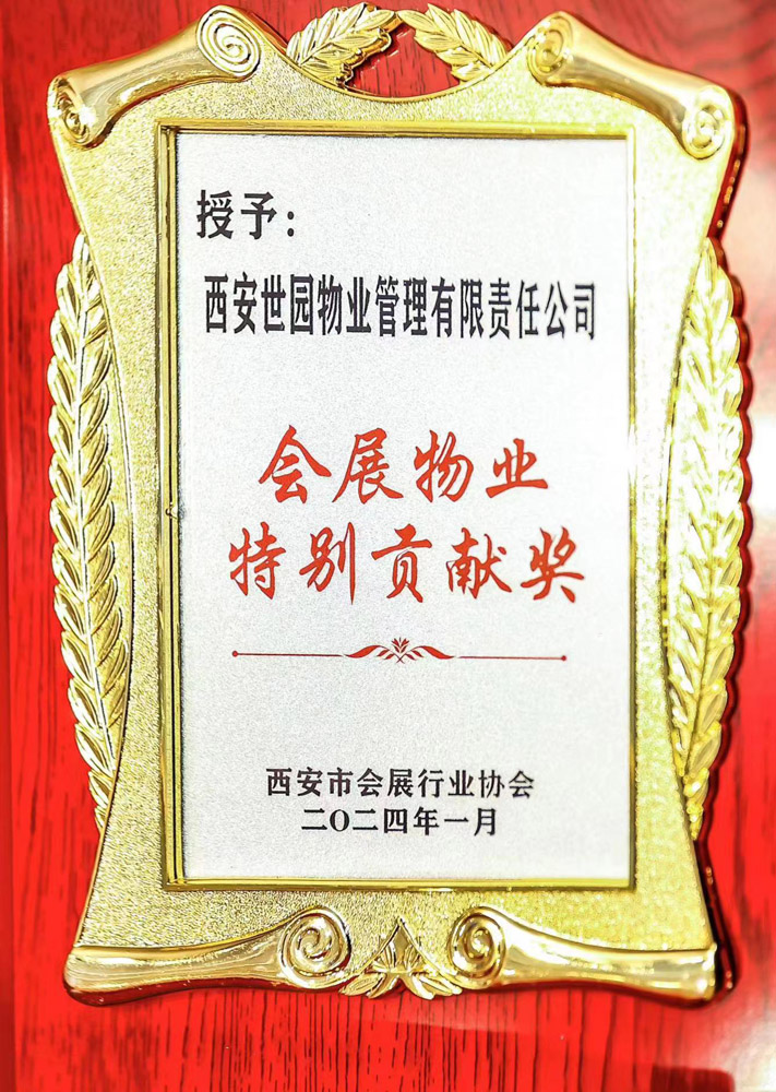 2024年1月19日,陕西省会展行业协会第一届第四次会员代表大会、西安市会展行业协会第五届第三次会员代表大会在西安会展中心会议楼召开,世园物业获得“会展物业特别贡献奖”,是唯一一家获得该奖项的企业。总经理张新道荣获会展“先进工作者”称号,赵宁丽、杨全魁两名员工获得“会展之星”称号。