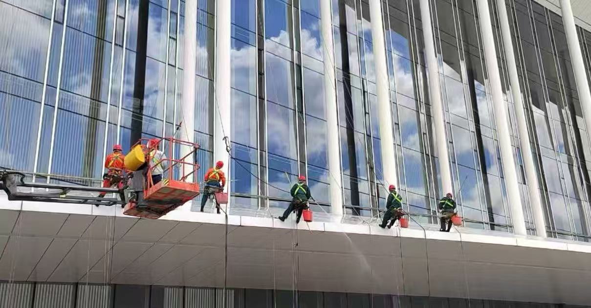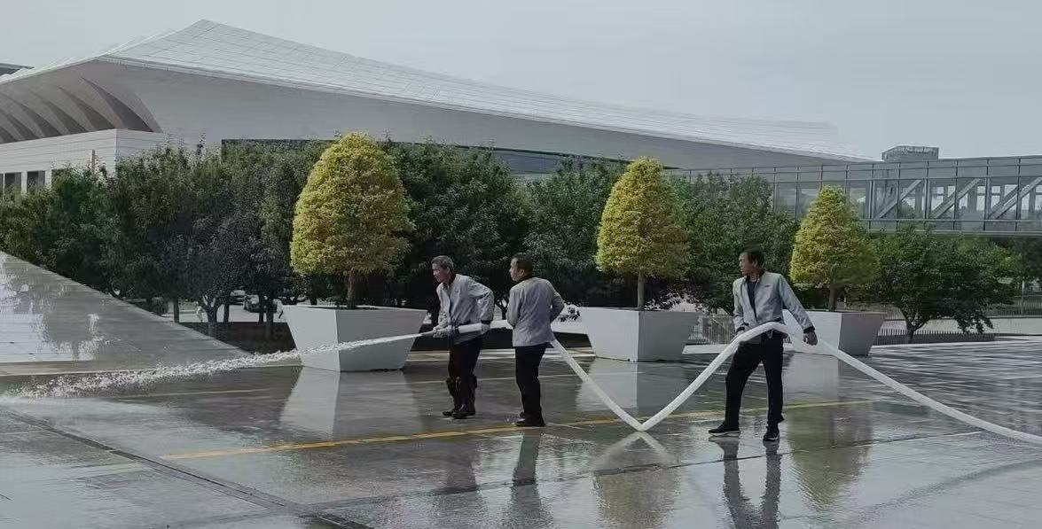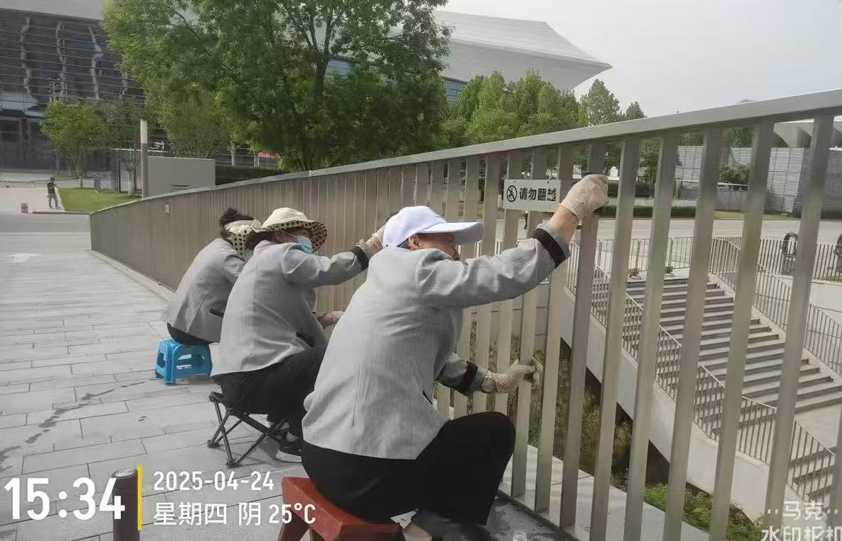 为保障盛会顺利举行,世园物业管理公司会议楼项目部提前半个月启动全维度环境优化工程:对高空月牙、外立面进行专业清洗,对室内外石材实施翻新养护与深度清洁;同步开展地毯、沙发、玻璃幕墙等多区域精细化保洁,并针对电梯、消防通道等重点区域进行专项清洁作业。同时,通过增加消杀频次,全方位筑牢卫生安全防线,为与会嘉宾营造安全舒适的场馆环境;此外,联动机械化道路保洁项目部,借助先进设备高效完成对场馆外围石材清洗工作。