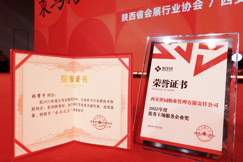 2025年12月24日,陕西省会展行业协会、西安市会展行业协会年会在西安国际会展中心会议楼召开,西安世园物业管理有限责任公司荣获“2025年度优秀主场服务企业奖”,公司张馨予荣获2025年度“会展之星”。